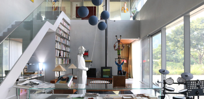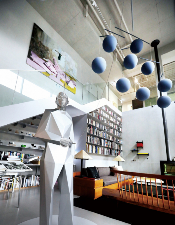 구하우스 미술관의 라이브러리는 그 자체로 예술입니다. 자비에 베이앙의 '모빌' 작품이 장식된 이 공간에서는 르 코르뷔지에를 오마주한 작품을 감상할 수 있으며, 건축과 디자인 관련 귀중한 서적들도 만나볼 수 있습니다.