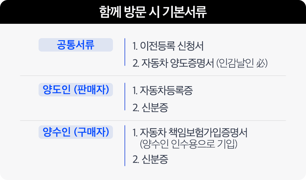 자동차 명의이전을 위해서는 다음과 같은 기본 서류와 조건이 필요합니다: