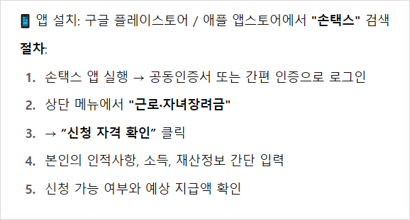 스마트폰에서 손택스 앱을 다운로드하여 로그인 후 신청자격을 확인하고 신청할 수 있습니다.