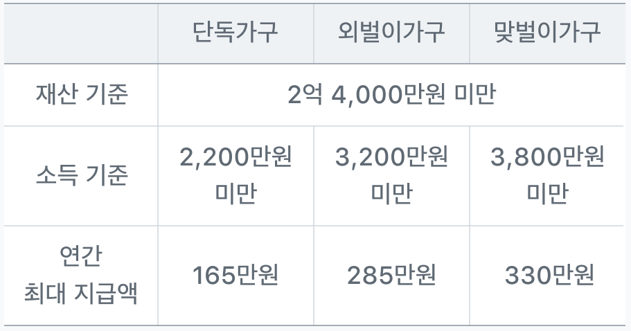 - 재산 요건: 가구 총재산이 2.4억원 미만